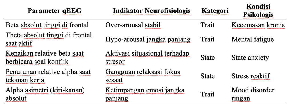 Quantitative EEG (qEEG) memetakan aktivitas listrik otak dan memungkinkan diferensiasi antara trait dan state secara neurofisiologis melalui dua metrik kunci: