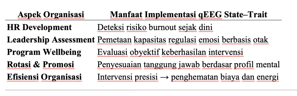 Dengan mengintegrasikan pendekatan state–trait psychology dan metodologi neuroscience (absolute vs. relative power qEEG), organisasi dan Korporasi kini dapat: